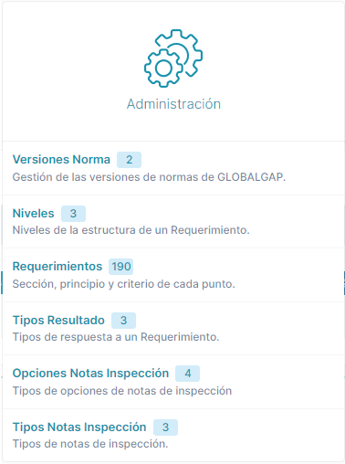Desde este menú, vamos a gestionar los registros base necesarios para la creación y gestion interna de todos los registros de auditorías, como pueden ser las versiones de norma de las diferentes certificaciones, requerimientos dependientes de la norma, registros tipo para las notas de inspección, etc.