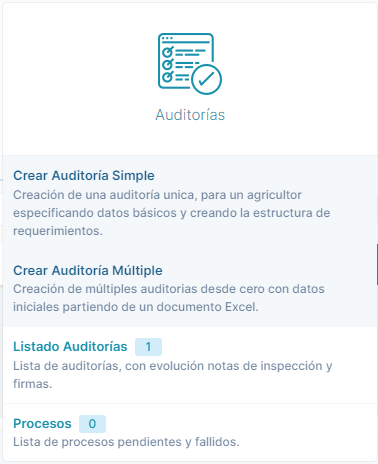 En este menú podemos realizar la creación base de las auditorías internas, de modo simple, es decir mediante un formulario común, o bien de modo múltiple haciendo uso de un excel externo y estableciendo una fonfiguración mínima para el formato a utilizar en la importacion de registros. También podremos acceder al listado en detalle de todas las auditorias creadas en la empresa seleccionada previamente. En la sección Listado de Auditorías (opens new window) tenemos la descripción de todos los elementos que forman parte de esta vista.