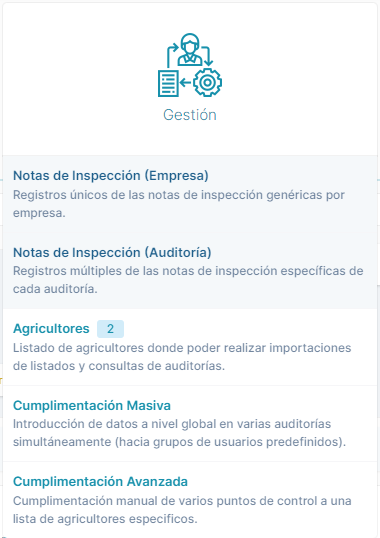Desde este menú, nos vamos a encontrar con la mayoria de funcionalidades de las auditorias ya creadas, por ejemplo la cumplimentación masiva, la cumplimentación avanzada, las notas de inspección o el listado de agricultores de esta empresa.